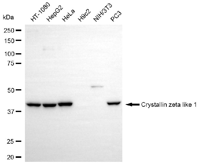 Western blotting analysis using crystallin zeta like 1 antibody. Total cell lysates (30 μg) from various cell lines were loaded and separated by SDS-PAGE. The blot was incubated with crystallin zeta like 1 antibody and HRP-conjugated goat mouse secondary antibody respectively.