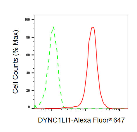 • Flow cytometric analysis of DYNC1LI1 expression in HepG2 cells using DYNC1LI1 antibody. Green, isotype control; red, DYNC1LI1.