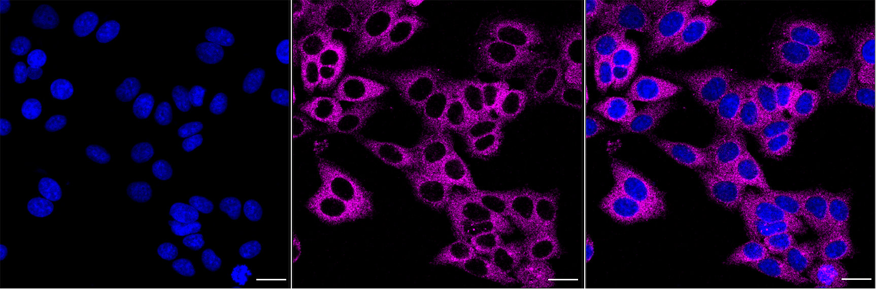 • Immunocytochemical staining of HepG2 cells with DYNC1LI1 antibody. Nuclei were stained blue with DAPI; DYNC1LI1 was stained magenta with Alexa Fluor? 647. Images were taken using Leica stellaris 5. Protein abundance based on laser Intensity and smart gain: Medium. Scale bar, 20 μm.