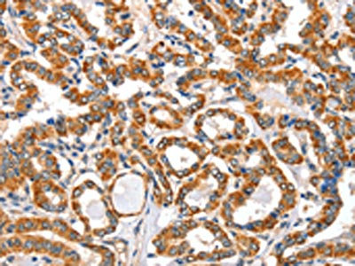 The image on the left is immunohistochemistry of paraffin-embedded Human thyroid cancer tissue using CSB-PA444394(AIFM3 Antibody) at dilution 1/40, on the right is treated with fusion protein. (Original magnification: ×200)