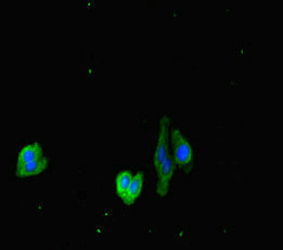 • Immunofluorescent analysis of HepG2 cells using CSB-PA818270LA01HU at dilution of 1:100 and Alexa Fluor 488-congugated AffiniPure Goat Anti-Rabbit IgG(H+L)