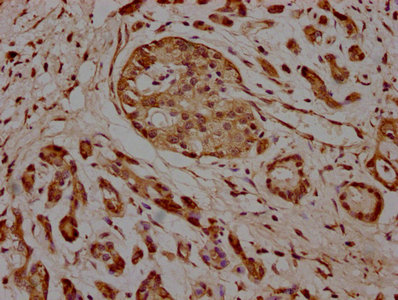 • IHC image of CSB-PA883440LA01HU diluted at 1:100 and staining in paraffin-embedded human pancreatic cancer performed on a Leica BondTM system. After dewaxing and hydration, antigen retrieval was mediated by high pressure in a citrate buffer (pH 6.0). Section was blocked with 10% normal goat serum 30min at RT. Then primary antibody (1% BSA) was incubated at 4°C overnight. The primary is detected by a biotinylated secondary antibody and visualized using an HRP conjugated SP system.