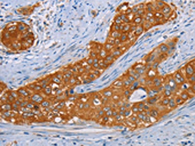 The image on the left is immunohistochemistry of paraffin-embedded Human cervical cancer tissue using CSB-PA616549(MMP1 Antibody) at dilution 1/55, on the right is treated with fusion protein. (Original magnification: ×200)