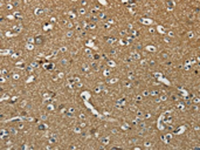 The image on the left is immunohistochemistry of paraffin-embedded Human brain tissue using CSB-PA139497(NEMF Antibody) at dilution 1/30, on the right is treated with synthetic peptide. (Original magnification: ×200)