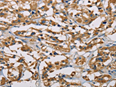 The image on the left is immunohistochemistry of paraffin-embedded Human thyroid cancer tissue using CSB-PA049702(PIP4K2A Antibody) at dilution 1/50, on the right is treated with fusion protein. (Original magnification: ×200)