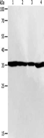Gel: 10%SDS-PAGE, Lysate: 50 μg, Lane 1-4: 293T cells, SKOV3 cells, NIH/3T3 cells, 231 cells, Primary antibody: CSB-PA644570(PSMD14 Antibody) at dilution 1/200, Secondary antibody: Goat anti rabbit IgG at 1/8000 dilution, Exposure time: 1 minute