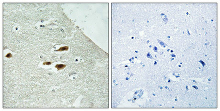 Immunohistochemistry analysis of paraffin-embedded human brain tissue using Period Circadian Protein 2 (Phospho-Ser662) antibody. The picture on the right is treated with the synthesized peptide.