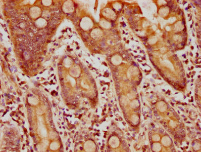 IHC image of CSB-PA840991LA01HU diluted at 1:400 and staining in paraffin-embedded human small intestine tissue performed on a Leica BondTM system. After dewaxing and hydration, antigen retrieval was mediated by high pressure in a citrate buffer (pH 6.0). Section was blocked with 10% normal goat serum 30min at RT. Then primary antibody (1% BSA) was incubated at 4°C overnight. The primary is detected by a biotinylated secondary antibody and visualized using an HRP conjugated SP system.