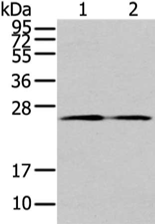 • Gel: 12%SDS-PAGE, Lysate: 40 μg, Lane 1-2: PC3 cell and human colon cancer tissue, Primary antibody: CSB-PA290881(TUSC1 Antibody) at dilution 1/200 dilution, Secondary antibody: Goat anti rabbit IgG at 1/8000 dilution, Exposure time: 1 minute