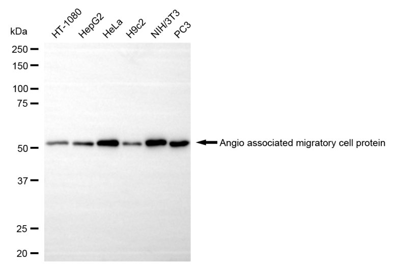 Western blotting analysis using angio associated migratory cell protein antibody. Total cell lysates (30 μg) from various cell lines were loaded and separated by SDS-PAGE. The blot was incubated with angio associated migratory cell protein antibody and HRP-conjugated goat anti-rabbit secondary antibody respectively.