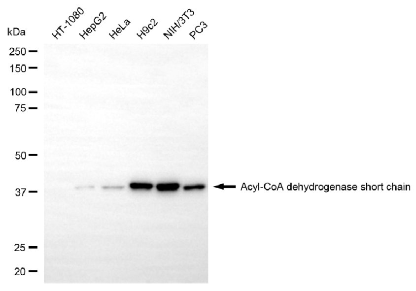 Western blotting analysis using acyl-CoA dehydrogenase short chain antibody. Total cell lysates (30 μg) from various cell lines were loaded and separated by SDS-PAGE. The blot was incubated with acyl-CoA dehydrogenase short chain antibody and HRP-conjugated goat anti-rabbit secondary antibody respectively.