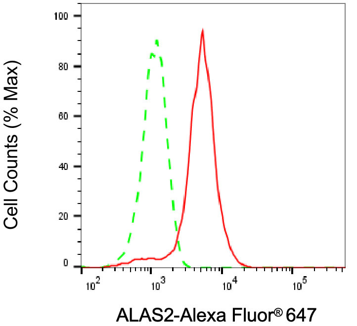 Flow cytometric analysis of ALAS2 expression in HepG2 cells using ALAS2 antibody. Green, isotype control; red, ALAS2.