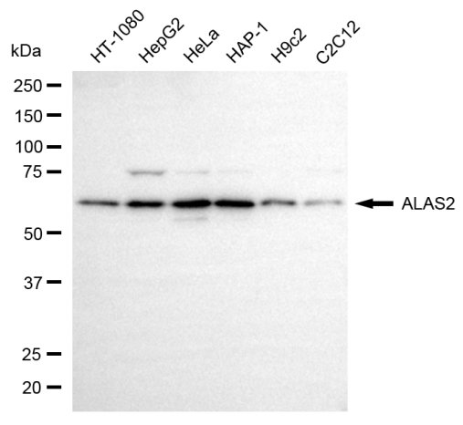 Western blotting analysis using ALAS2 antibody. Total cell lysates (30 μg) from various cell lines were loaded and separated by SDS-PAGE. The blot was incubated with ALAS2 antibody and HRP-conjugated goat anti-rabbit secondary antibody respectively.
