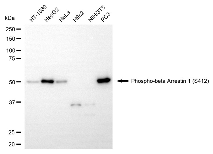 Western blotting analysis using phospho-beta arrestin 1 (S412) antibody. Total cell lysates (30 μg) from various cell lines were loaded and separated by SDS-PAGE. The blot was incubated with phospho-beta arrestin 1 (S412) antibody and HRP-conjugated goat anti-rabbit secondary antibody respectively.