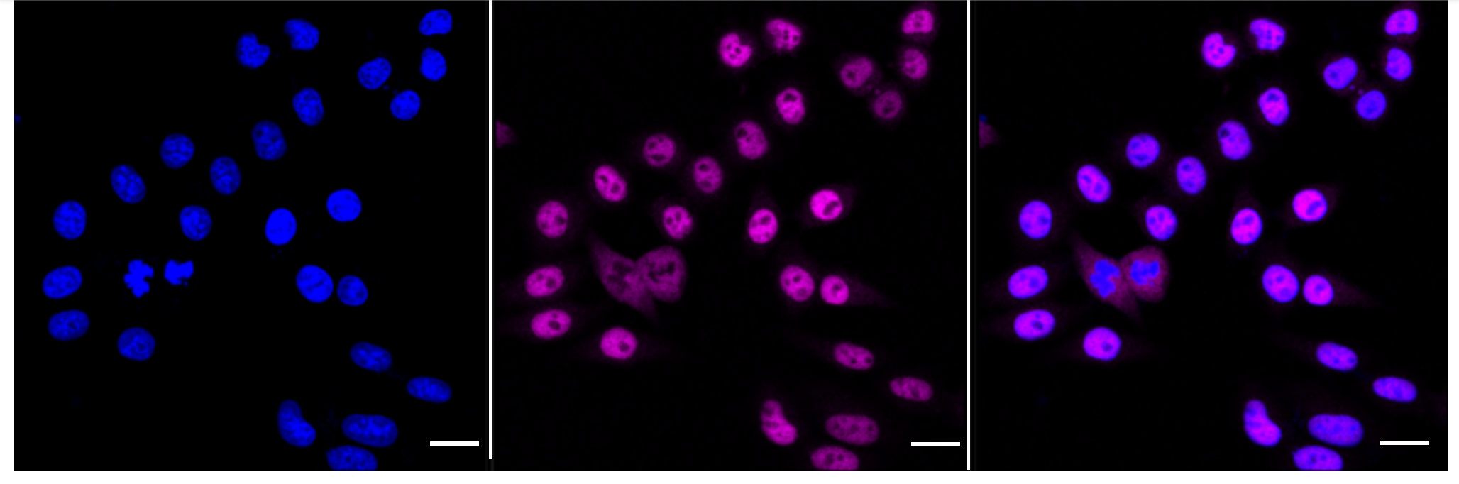 Immunocytochemical staining of HepG2 cells with BAG cochaperone 6 antibody. Nuclei were stained blue with DAPI; BAG cochaperone 6 was stained magenta with Alexa Fluor? 647. Images were taken using Leica stellaris 5. Protein abundance based on laser Intensity and smart gain: Meidum. Scale bar: 20 μm.