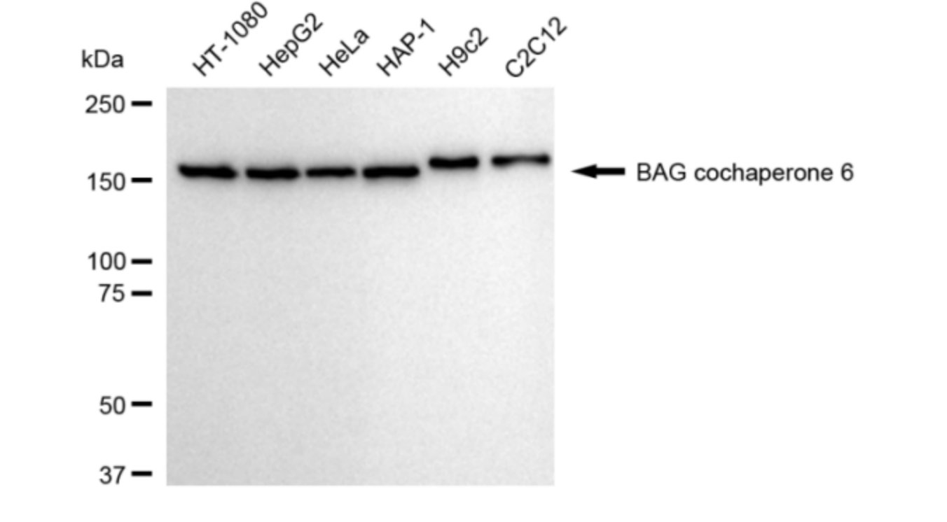 Western blotting analysis using BAG cochaperone 6 antibody. Total cell lysates (30 μg) from various cell lines were loaded and separated by SDS-PAGE. The blot was incubated with BAG cochaperone 6 antibody and HRP-conjugated goat anti-rabbit secondary antibody respectively.