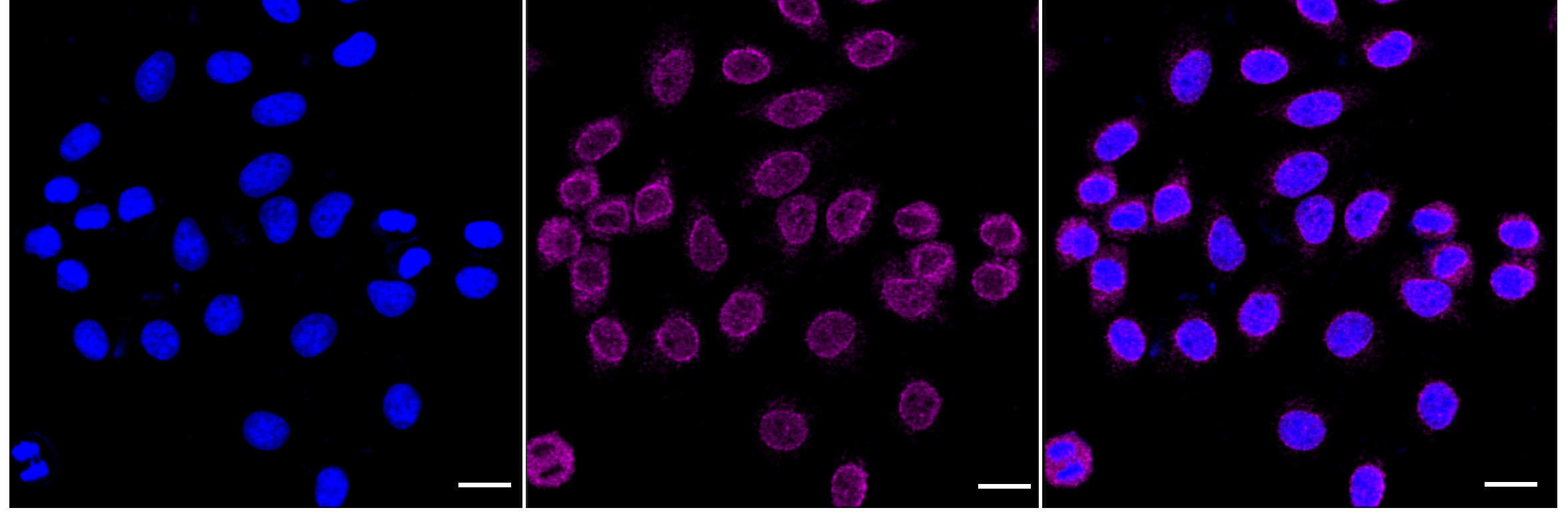 Immunocytochemical staining of HepG2 cells with bone marrow stromal cell antigen 2 antibody. Nuclei were stained blue with DAPI; Bone marrow stromal cell antigen 2 was stained magenta with Alexa Fluor? 647. Images were taken using Leica stellaris 5. Protein abundance based on laser Intensity and smart gain: Medium. Scale bar: 20 μm.