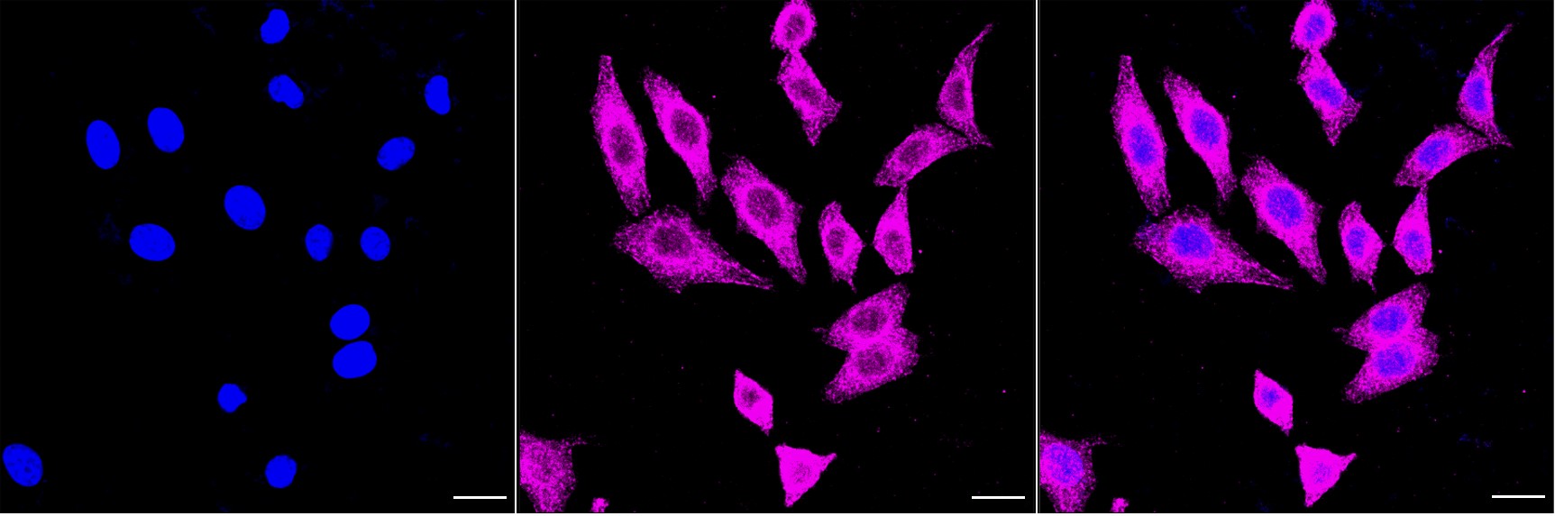 Immunocytochemical staining of HepG2 cells with CLIP1 antibody. Nuclei were stained blue with DAPI; CLIP1 was stained magenta with Alexa Fluor? 647. Images were taken using Leica stellaris 5. Protein abundance based on laser Intensity and smart gain: Medium. Scale bar, 20 μm.