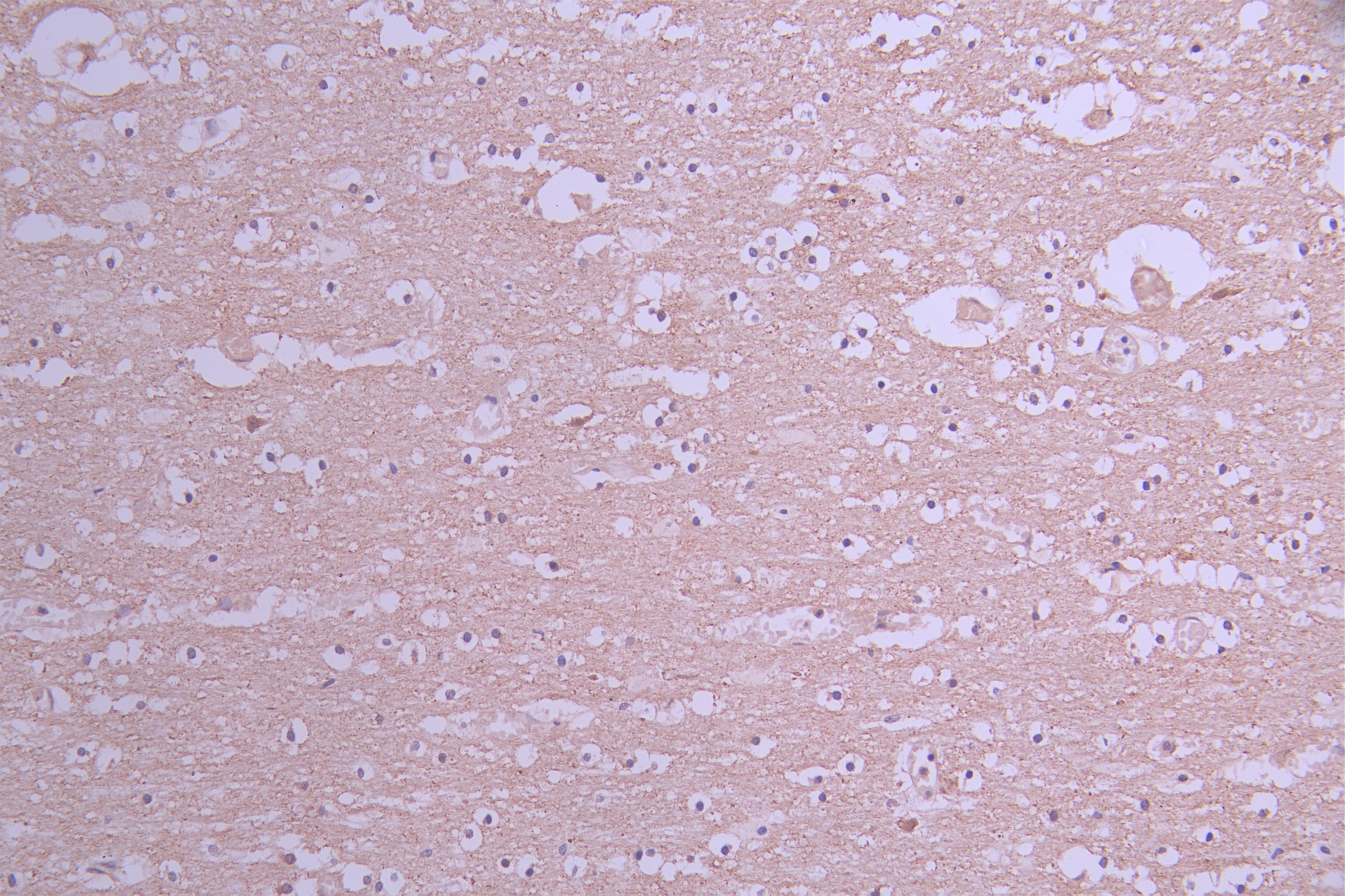 IHC image of CSB-RA970319A0HU diluted at 1:100 and staining in paraffin-embedded human brain tissue performed on a Leica BondTM system. After dewaxing and hydration, antigen retrieval was mediated by high pressure in a citrate buffer (pH 6.0). Section was blocked with 10% normal goat serum 30min at RT. Then primary antibody (1% BSA) was incubated at 4°C overnight. The primary is detected by a Goat anti-rabbit polymer IgG labeled by HRP and visualized using 0.05% DAB.