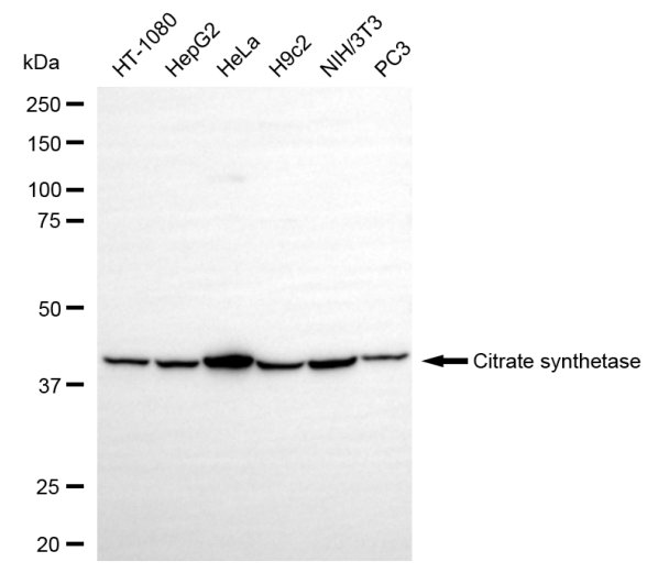 Western blotting analysis using citrate synthetase antibody. Total cell lysates (30 μg) from various cell lines were loaded and separated by SDS-PAGE. The blot was incubated with citrate synthetase antibody and HRP-conjugated goat anti-rabbit secondary antibody respectively.