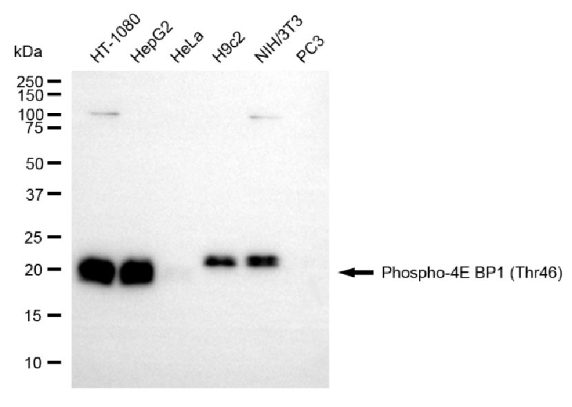 Western blotting analysis using phospho-4E BP1 (Thr46) antibody. Total cell lysates (30 μg) from various cell lines were loaded and separated by SDS-PAGE. The blot was incubated with phospho-4E BP1 (Thr46) antibody and HRP-conjugated goat anti-rabbit secondary antibody respectively.