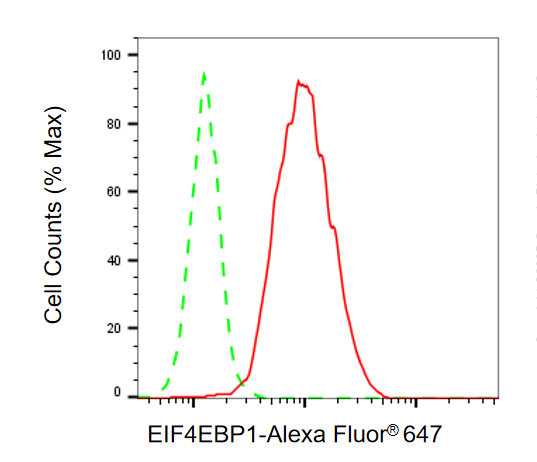 Flow cytometric analysis of EIF4EBP1 expression in C2C12 cells using EIF4EBP1 antibody. Green, isotype control; red, EIF4EBP1.