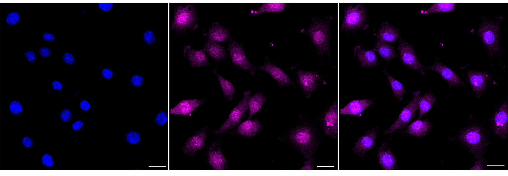 Immunocytochemical staining of C2C12 cells with EIF4EBP1 antibody. Nuclei were stained blue with DAPI; EIF4EBP1 was stained magenta with Alexa Fluor? 647. Images were taken using Leica stellaris 5. Protein abundance based on laser Intensity and Smart Gain: Medium. Scale bar, 20 μm.
