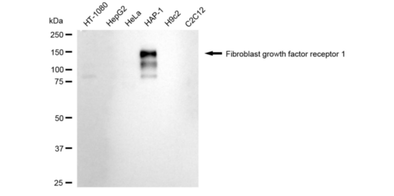 Western blotting analysis using Fibroblast growth factor receptor 1 antibody. Total cell lysates (30 μg) from various cell lines were loaded and separated by SDS-PAGE. The blot was incubated with Fibroblast growth factor receptor 1 antibody and HRP-conjugated goat anti-rabbit secondary antibody respectively.