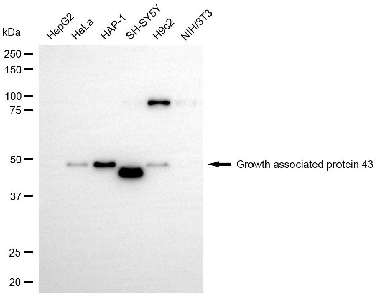 Western blotting analysis using growth associated protein 43 antibody. Total cell lysates (30 μg) from various cell lines were loaded and separated by SDS-PAGE. The blot was incubated with growth associated protein 43 antibody and HRP-conjugated goat anti-rabbit secondary antibody respectively.