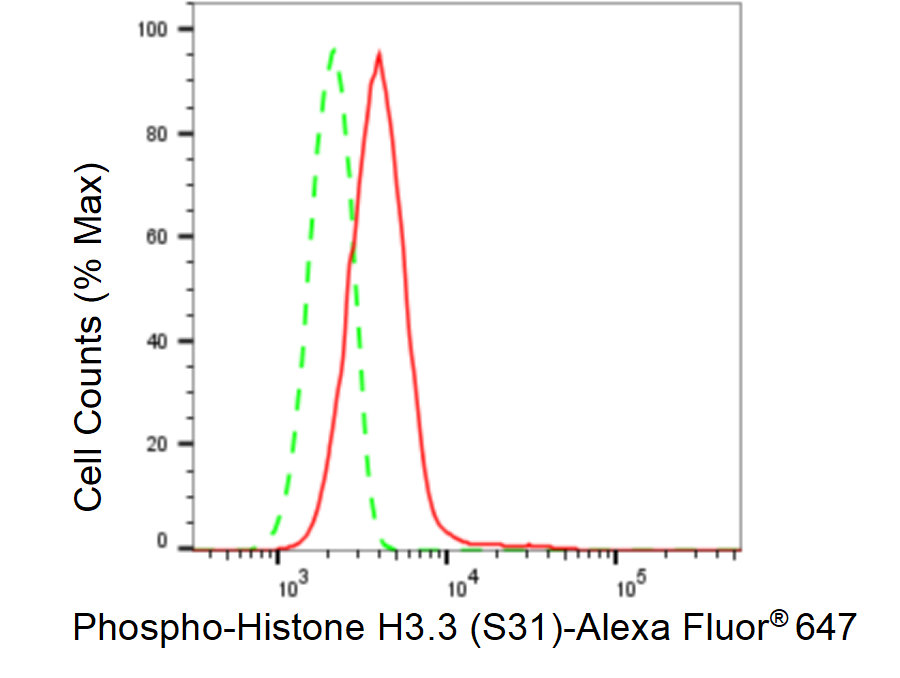 Flow cytometric analysis of Phospho-Histone H3.3 (S31) expression in HepG2 cells using Phospho-Histone H3.3 (S31) antibody. Green, isotype control; red, Phospho-Histone H3.3 (S31).