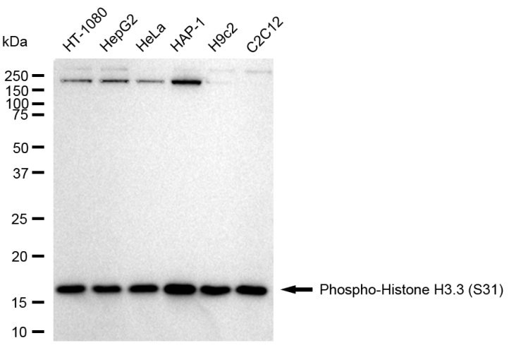 Western blotting analysis using Phospho-Histone H3.3 (S31) antibody. Total cell lysates (5 μg) from various cell lines were loaded and separated by SDS-PAGE. The blot was incubated with Phospho-Histone H3.3 (S31) antibody and HRP-conjugated goat anti-rabbit secondary antibody respectively.