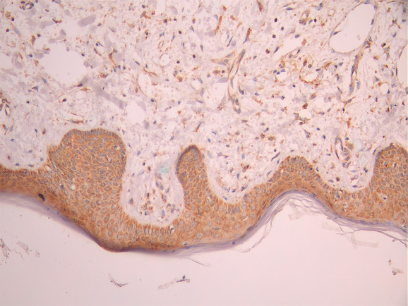 IHC image of CSB-RA272247A0HU diluted at 1:100 and staining in paraffin-embedded human skin tissue performed on a Leica BondTM system. After dewaxing and hydration, antigen retrieval was mediated by high pressure in a citrate buffer (pH 6.0). Section was blocked with 10% normal goat serum 30min at RT. Then primary antibody (1% BSA) was incubated at 4°C overnight. The primary is detected by a Goat anti-rabbit polymer IgG labeled by HRP and visualized using 0.05% DAB.