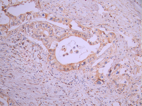 IHC image of CSB-RA272247A0HU diluted at 1:100 and staining in paraffin-embedded human pancreatic cancer performed on a Leica BondTM system. After dewaxing and hydration, antigen retrieval was mediated by high pressure in a citrate buffer (pH 6.0). Section was blocked with 10% normal goat serum 30min at RT. Then primary antibody (1% BSA) was incubated at 4°C overnight. The primary is detected by a Goat anti-rabbit polymer IgG labeled by HRP and visualized using 0.05% DAB.