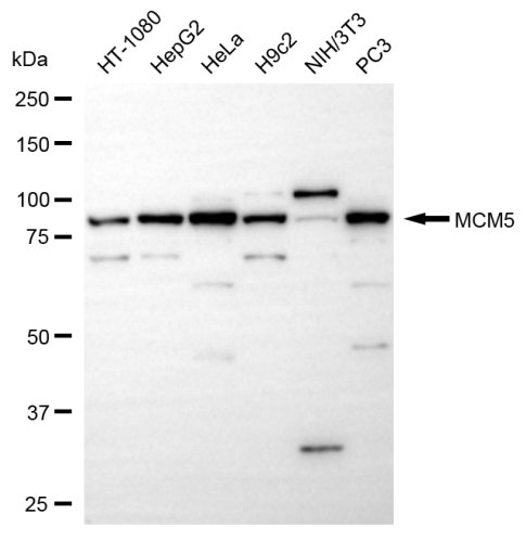 Western blotting analysis using MCM5 antibody. Total cell lysates (30 μg) from various cell lines were loaded and separated by SDS-PAGE. The blot was incubated with MCM5 antibody and HRP-conjugated goat anti-rabbit secondary antibody respectively.