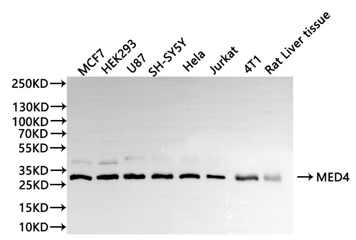 , Positive WB detected in:MCF7 whole cell lysate(30μg), HEK293 whole cell lysate(30μg), U87 whole cell lysate(30μg), SH-SY5Y whole cell lysate(30μg), Hela whole cell lysate(30μg), Jurkat whole cell lysate(30μg), 4T1 whole cell lysate(30μg), Rat liver tissue lysate(30μg)