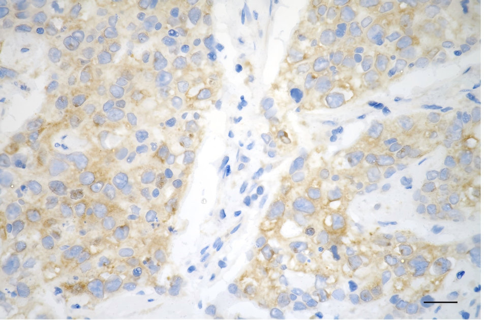 • Immunohistochemistry was performed on paraffin-embedded human breast carcinoma using PA2G4 antibody. Antigen retrieval was done in sodium citrate buffer (pH 6.0). DAB was used for detection, with hematoxylin counterstaining. Images were acquired using a Nikon Ci-L Plus microscope (40× objective). Scale bar: 25 μm.
