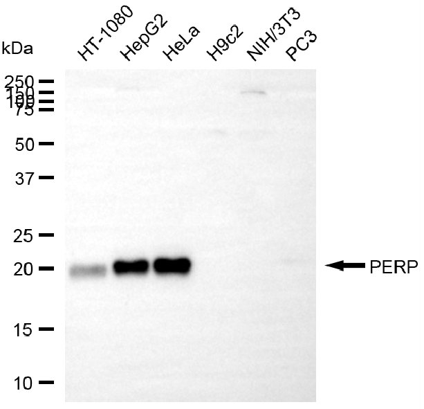Western blotting analysis using PERP antibody. Total cell lysates (30 μg) from various cell lines were loaded and separated by SDS-PAGE. The blot was incubated with PERP antibody and HRP-conjugated goat anti-rabbit secondary antibody respectively.
