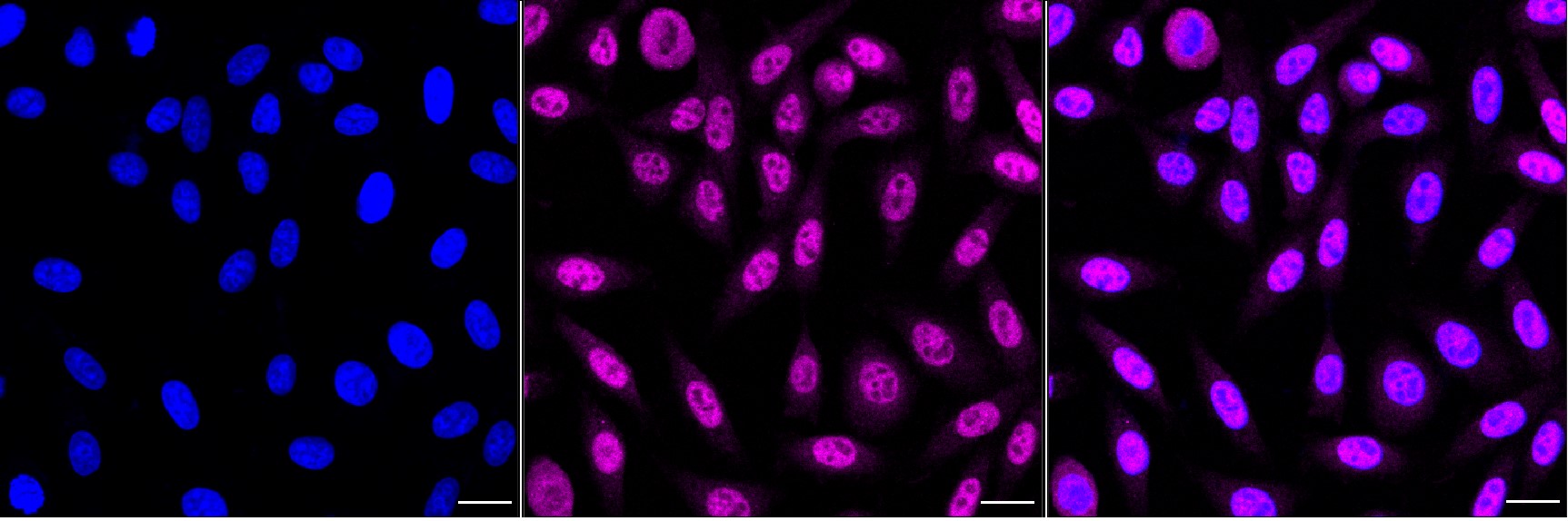 Immunocytochemical staining of HepG2 cells with Phospho-PKC alpha (Thr638) antibody. Nuclei were stained blue with DAPI; Phospho-PKC alpha (Thr638) was stained magenta with Alexa Fluor? 647. Images were taken using Leica stellaris 5. Protein abundance based on laser Intensity and smart gain: Medium. Scale bar, 20 μm.