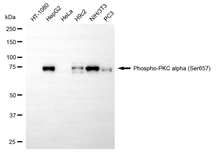 Western blotting analysis using phospho-PKC alpha (Ser657) antibody. Total cell lysates (30 μg) from various cell lines were loaded and separated by SDS-PAGE. The blot was incubated with phospho-PKC alpha (Ser657) antibody and HRP-conjugated goat anti-rabbit secondary antibody respectively.