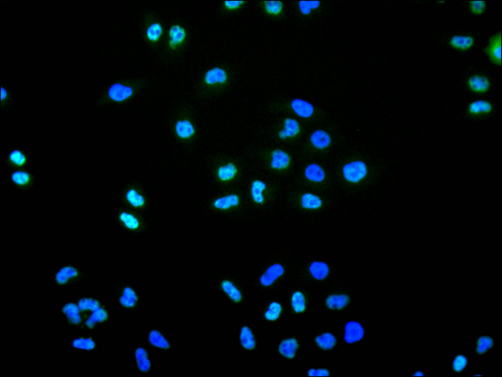 Immunofluorescence staining of HeLa cell with CSB-RA244708A0HU at 1:50 , counter-stained with DAPI. The cells were fixed in 4% formaldehyde, permeabilized using 0.2% Triton X-100 and blocked in 10% normal Goat Serum. The cells were then incubated with the antibody overnight at 4°C. The secondary antibody was Alexa Fluor 488-congugated AffiniPure Goat Anti-Rabbit IgG(H+L).