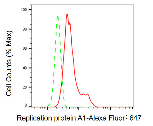 Flow cytometric analysis of replication protein A1 expression in HepG2 cells using replication protein A1 antibody. Green, isotype control; red, replication protein A1.