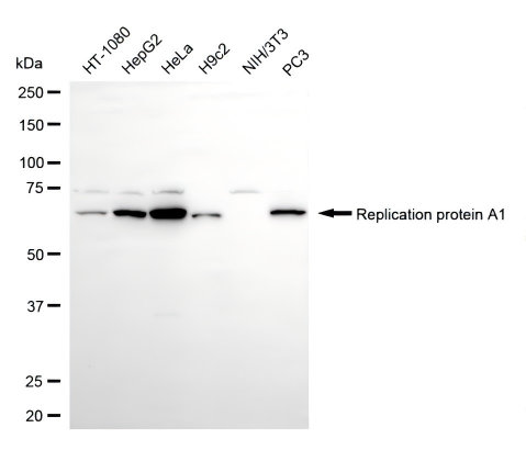 Western blotting analysis using replication protein A1 antibody. Total cell lysates (30 μg) from various cell lines were loaded and separated by SDS-PAGE. The blot was incubated with replication protein A1 antibody and HRP-conjugated goat anti-rabbit secondary antibody respectively.