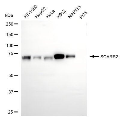 Western blotting analysis using SCARB2 antibody. Total cell lysates (30 μg) from various cell lines were loaded and separated by SDS-PAGE. The blot was incubated with SCARB2 antibody and HRP-conjugated goat anti-rabbit secondary antibody respectively.