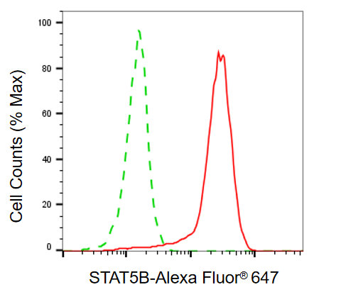 Flow cytometric analysis of STAT5B expression in HepG2 cells using STAT5B antibody. Green, isotype control; red, STAT5B.