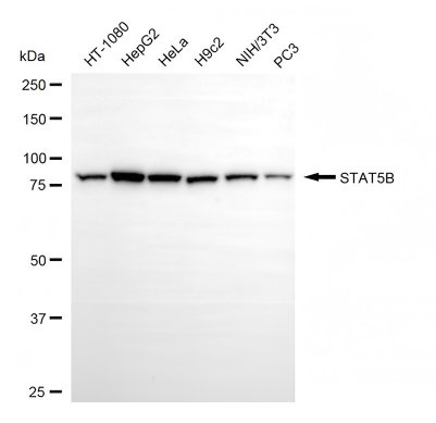 Western blotting analysis using STAT5B antibody. Total cell lysates (30 μg) from various cell lines were loaded and separated by SDS-PAGE. The blot was incubated with STAT5B antibody and HRP-conjugated goat anti-rabbit secondary antibody respectively.