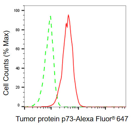 Flow cytometric analysis of tumor protein p73 expression in HAP-1 cells using tumor protein p73 antibody. Green, isotype control; red, tumor protein p73.