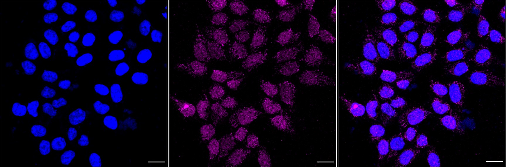 Immunocytochemical staining of HAP-1 cells with Tumor protein p73 antibody. Nuclei were stained blue with DAPI; Tumor protein p73 was stained magenta with Alexa Fluor? 647. Images were taken using Leica stellaris 5. Protein abundance based on laser Intensity and smart gain: Medium. Scale bar, 20 μm.
