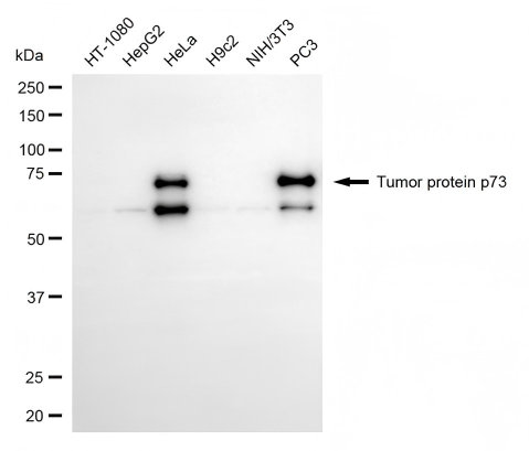 Western blotting analysis using tumor protein p73 antibody. Total cell lysates (30 μg) from various cell lines were loaded and separated by SDS-PAGE. The blot was incubated with tumor protein p73 antibody and HRP-conjugated goat anti-rabbit secondary antibody respectively.