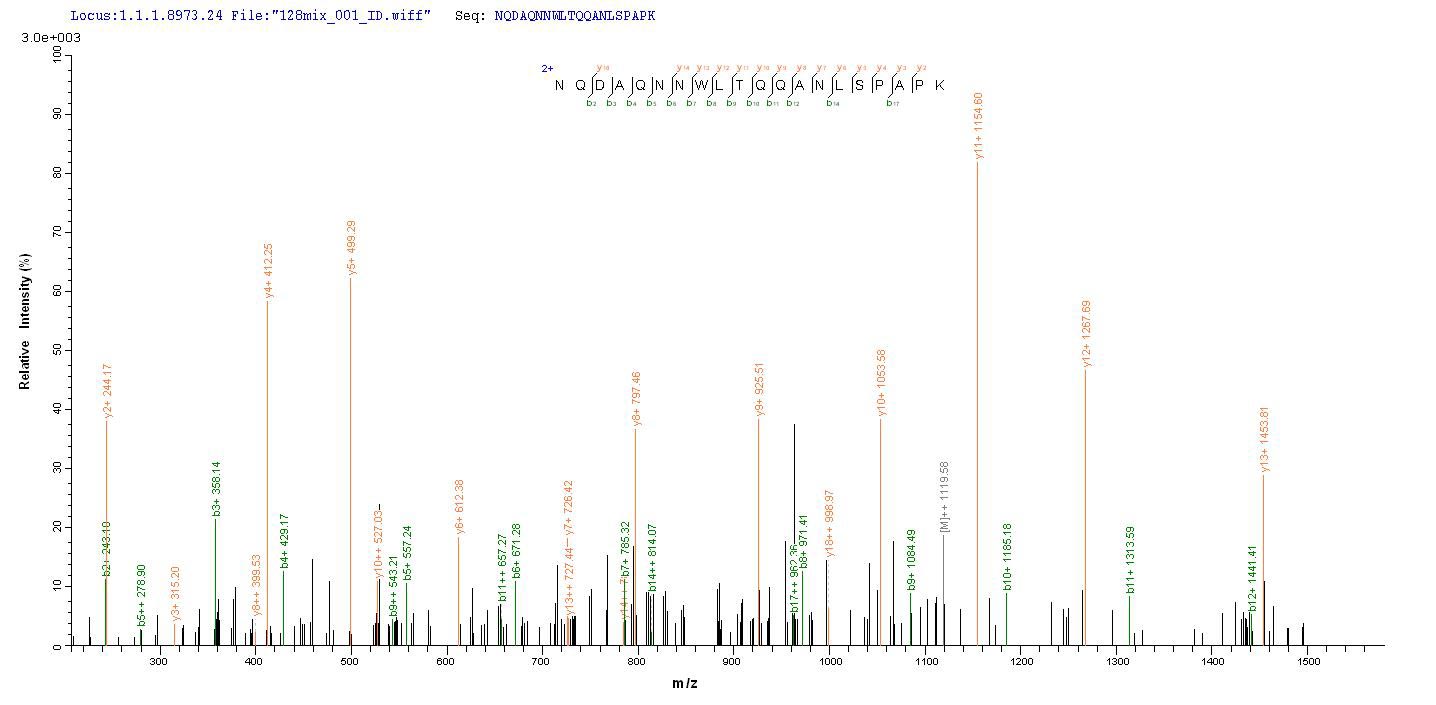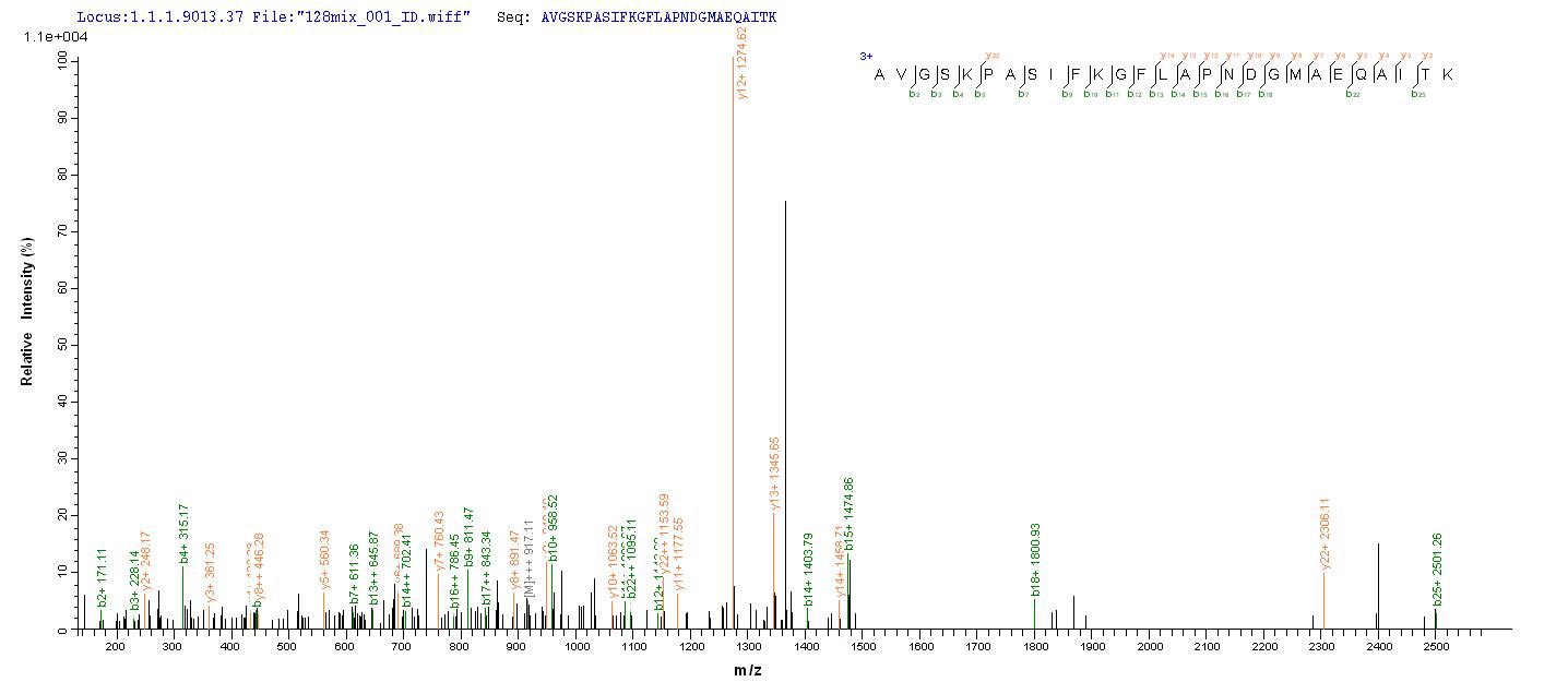 Based on the SEQUEST from database of E.coli host and target protein, the LC-MS/MS Analysis result of CSB-EP313811MWK could indicate that this peptide derived from E.coli-expressed Mycoplasma hyopneumoniae (strain 232) p46.