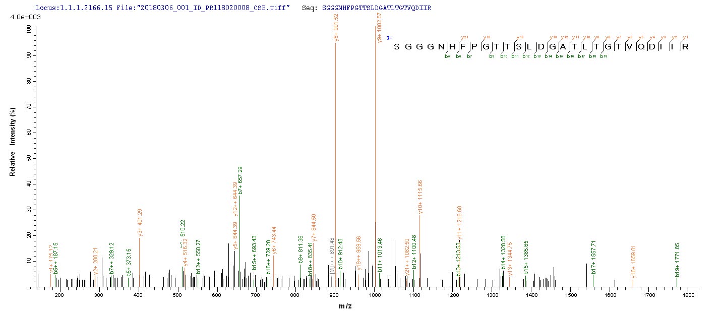 Based on the SEQUEST from database of E.coli host and target protein, the LC-MS/MS Analysis result of CSB-EP028075FFZ could indicate that this peptide derived from E.coli-expressed Pseudomonas putida (Arthrobacter siderocapsulatus) crnA.